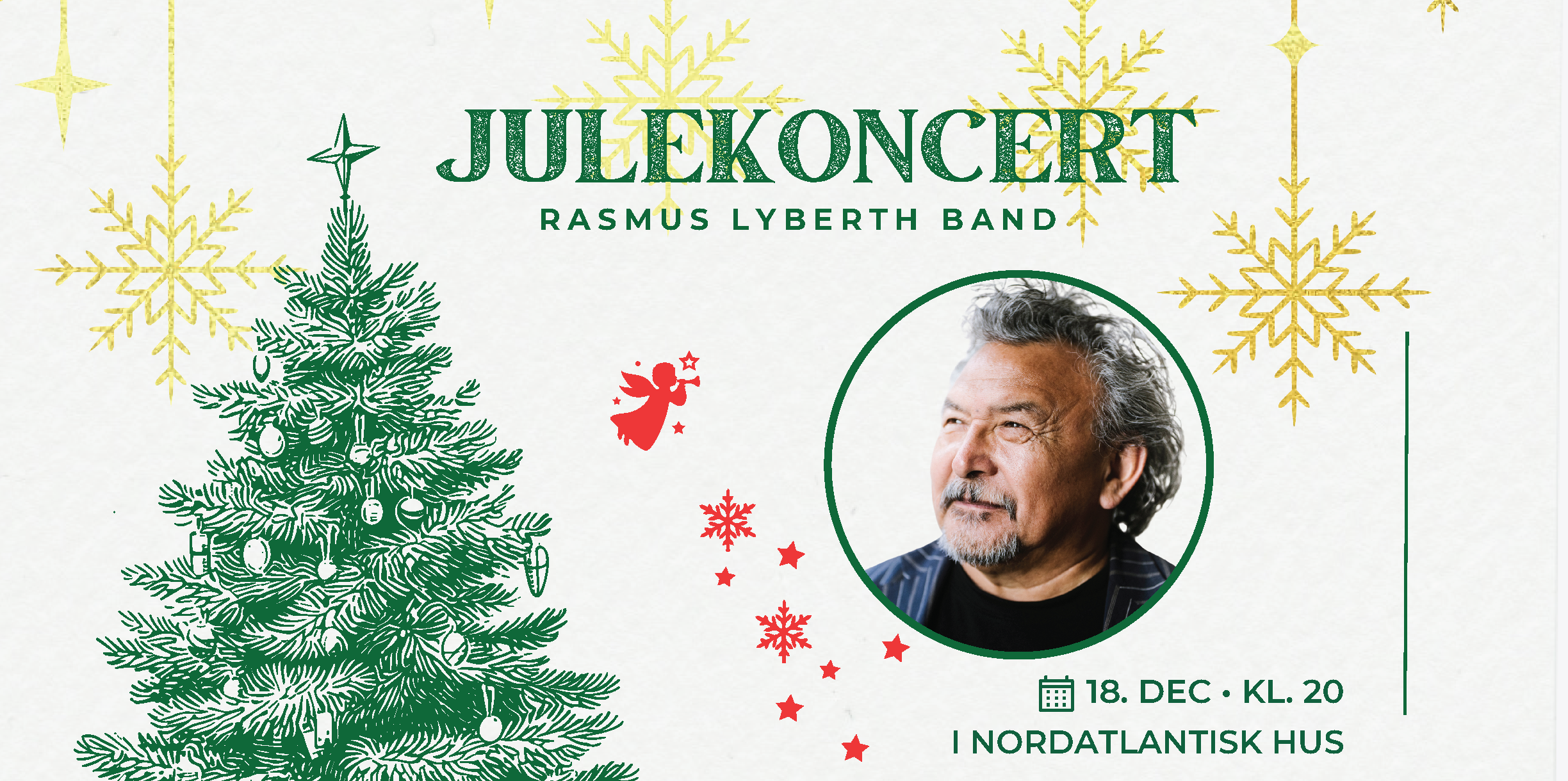 Rasmus Lyberth er tilbage på scenen i Nordatlantisk Hus med sin traditionsrige julekoncert og sit faste band bestående af Kristoffer Jul på keyboard, Alain Apaloo på guitar, Ayi Solomon på trommer, Ulrik Skytte på bas og Jane Clack på violin.